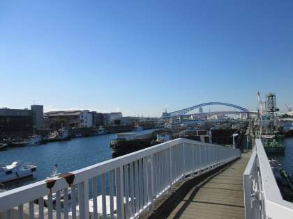 カラフルな船舶を眺めることのできる「はしけ桟橋」。