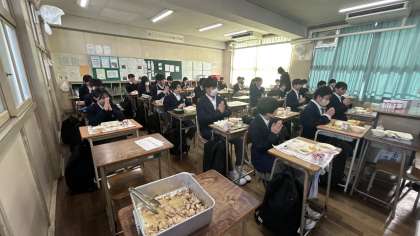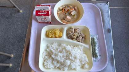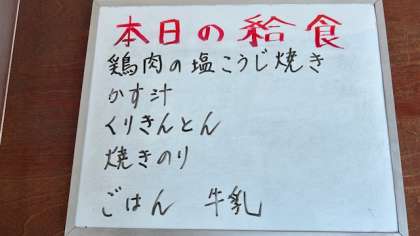 今日の給食は、鶏肉の塩麹焼き、かす汁、栗きんとんです。焼き海苔がついています。