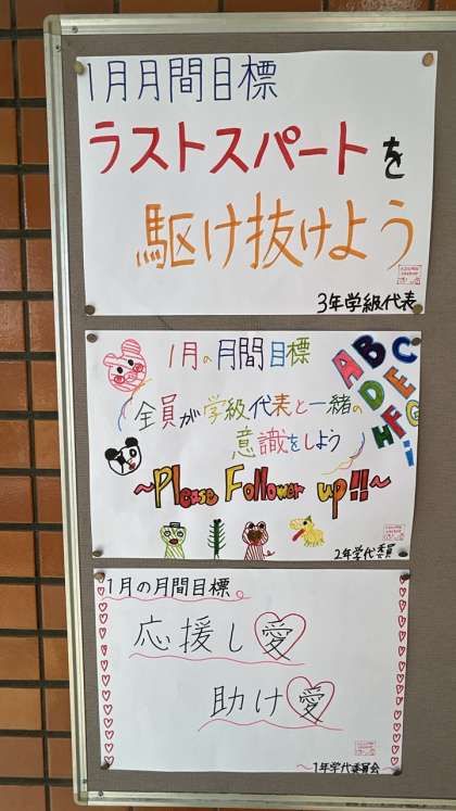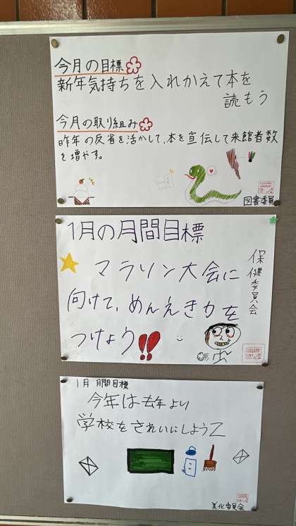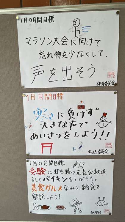 各委員会から1月の目標が全校集会で発表されました。そのポスターが玄関の入り口に貼られています。また独創的な絵がたくさん描かれていますね^_^