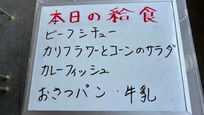 今日の給食は、ビーフシチュー、カリフラワーとコーンのサラダ、カレーフィッシュです。パンはおさつパンです。