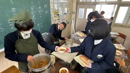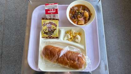 今日のパンはおさつパンです。中にサツマイモがたくさん入った甘くておいしいパンです。ビーフシチューによく合うのではないでしょうか?