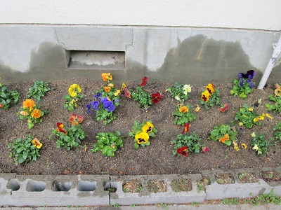 管理作業員さんが、校舎の一角に、春を思わせるパンジー、三色すみれを植えてくださいました。