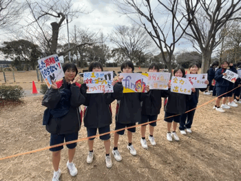 女子が、男子のために時間をかけて作った応援プラカード。何か手を振っている子もいて、愛嬌を感じます。