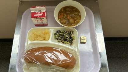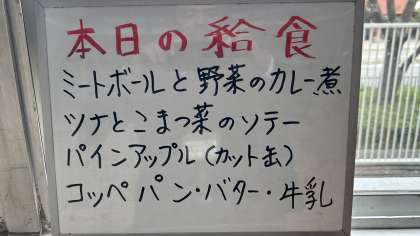 今日の給食は、ミートボールと野菜のカレー煮、ツナと小松菜のソテー、パインアップル(カット缶)です。パンにはバターがついています。