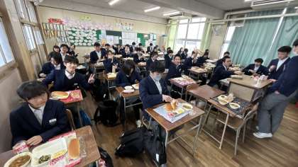 今日の給食には、小松菜が入っています。小松菜は寒さに強く、冬が旬の野菜なので「冬菜」「雪菜」とも呼ばれています。カルシウムや鉄分を多く含んでいます。体の調子を整えるために、野菜をたくさん食べましょう。!
