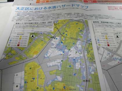 大阪市危機管理室の「市民防災マニュアル」と大正区の「水害ハザードマップ」。