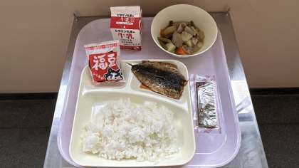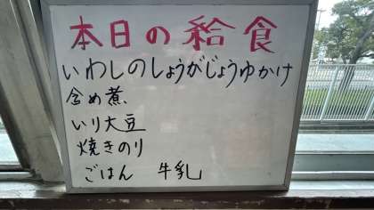 今日の給食は、イワシの生姜醤油かけ、含め煮、いり大豆です。ご飯には焼き海苔がついています。