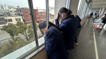 やっぱり今日は寒いですね。雪が舞い始めました。生徒がそれを見て、窓から雪を捕まえようとしています。寒いのにねぇ。