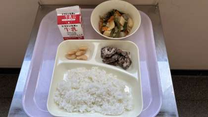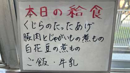 今日の給食は、クジラの竜田揚げ、豚肉とじゃがいもの煮物、白花豆の煮物です。