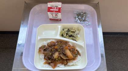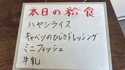 今日の給食は、ハヤシライス、キャベツのひじきドレッシング、ミニフィッシュです。