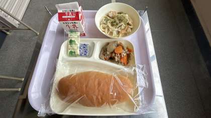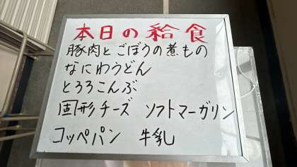 今日の給食は、豚肉とごぼうの煮物、なにわうどん(とろろ昆布付)、固形チーズです。パンにはソフトマーガリンがついています。