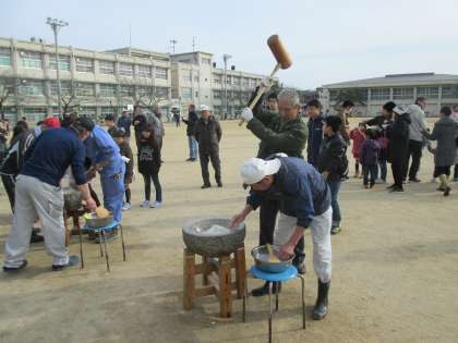 少しだけ、もちをつかせていただきましたが、普段の運動不足のせいか、すぐに筋肉痛に・・・。