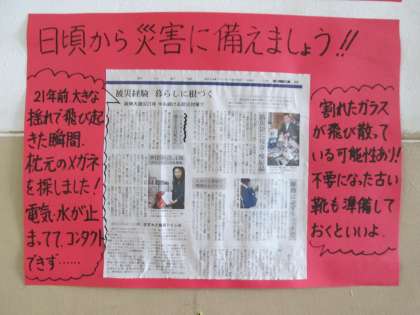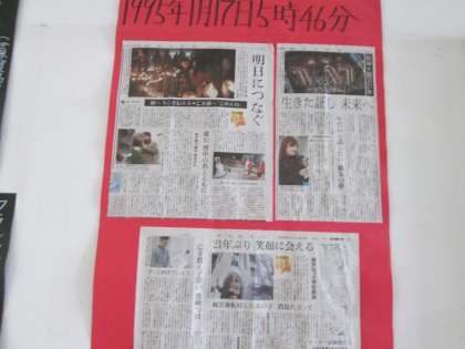 「阪神淡路大震災」 新聞に取り上げられている記事が、1年廊下に掲示されています。