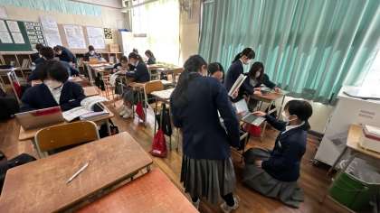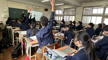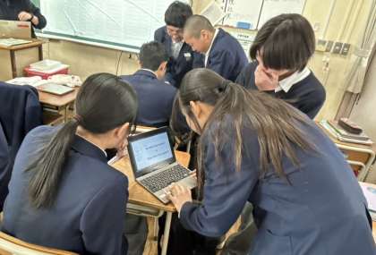 学習者用端末を活用して、英文の問題とその解答をグループで作成して、披露する授業のようです。解答がわかった生徒は挙手を!っと、元気に手を挙げる生徒が魅力的でした(^。^)