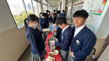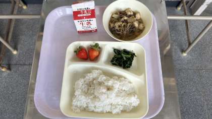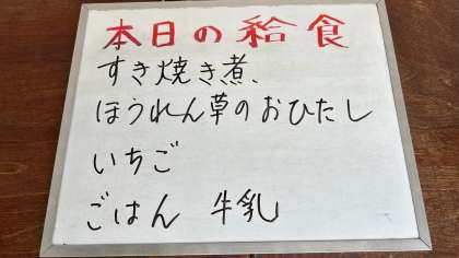 今日の給食は、すき焼き煮、ほうれんそうのお浸し、いちごです。