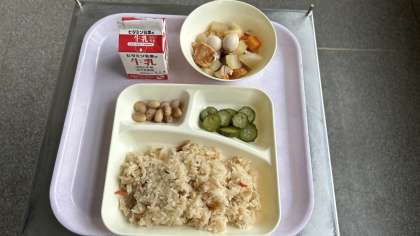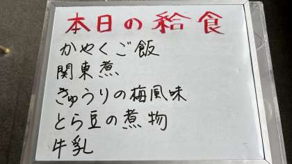 今日の給食は、関東煮、きゅうりの梅風味、虎豆の煮物です。ご飯はかやくご飯です。