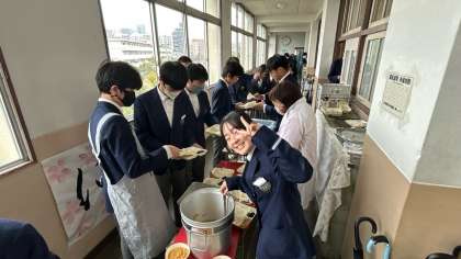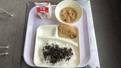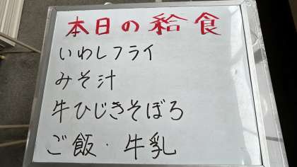 今日の給食は、いわしフライ、味噌汁、牛ひじきそぼろです。