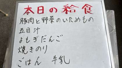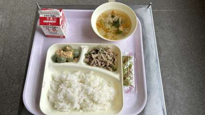 今日の給食は、豚肉と野菜の炒め物、五目汁、よもぎ団子、焼き海苔です。