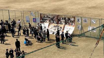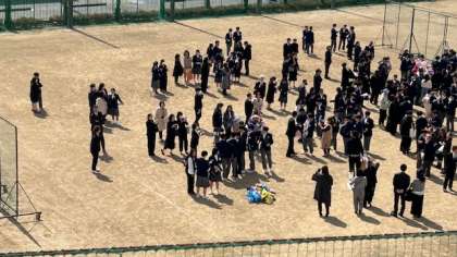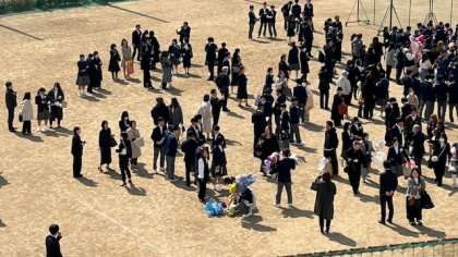 卒業式後は花道を通って、運動場で記念撮影と歓談。お別れを惜しんでいます、、。