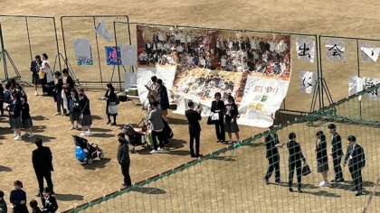 どこから、大きなバルーンが登場していますねー。運動場の真ん中には、3年生が文化祭の時に制作した「モザイクアート」が、卒業の花を添えています。