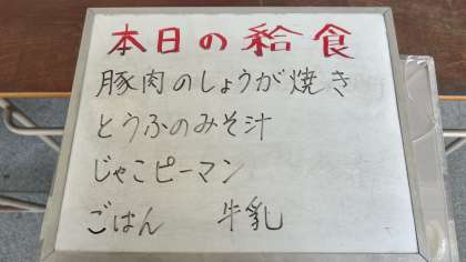 今日の給食は、豚肉の生姜焼き、豆腐の味噌汁、じゃこピーマンです。