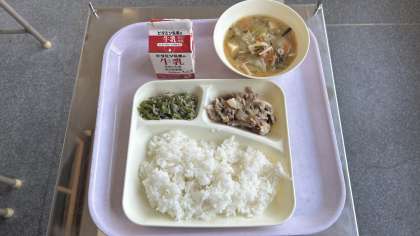 今日から給食が始まりました。栄養バランスの良い給食です。残さず、好き嫌いせず、しっかり食べましょう^_^