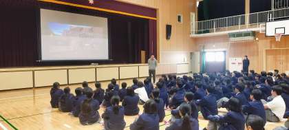 全校集会の後、体育館をお借りして一泊移住の説明がありました。