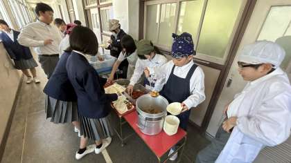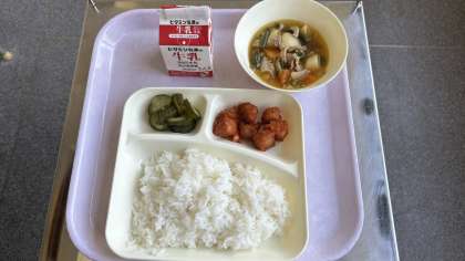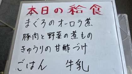 今日の給食は、まぐろのオーロラ煮、豚肉と野菜の煮物、きゅうりの甘酢漬けです。