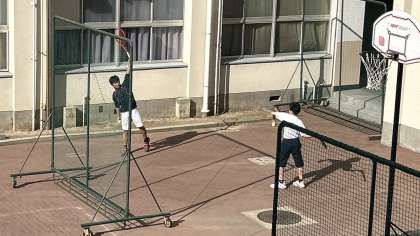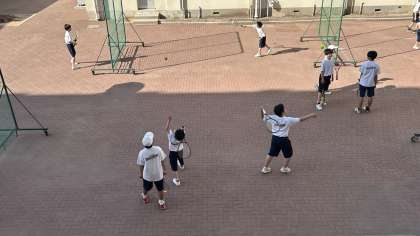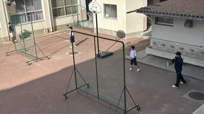 硬式テニスが、中庭で練習をしています。運動場も割り当てがあるので、仕方ないか、、、。