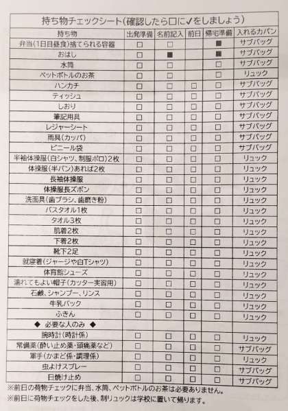 1年生☆一泊移住持ち物チェックシート