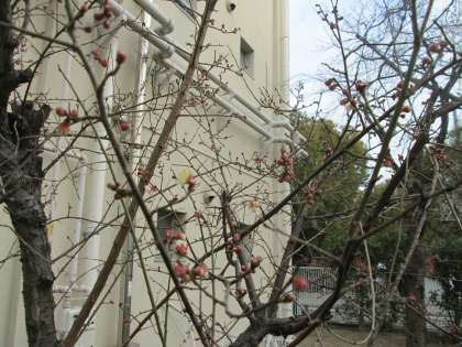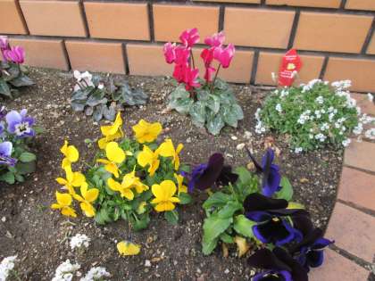 寒さと戦うパンジー・シクラメンは色鮮やかで、梅も、また一輪、開花しています。