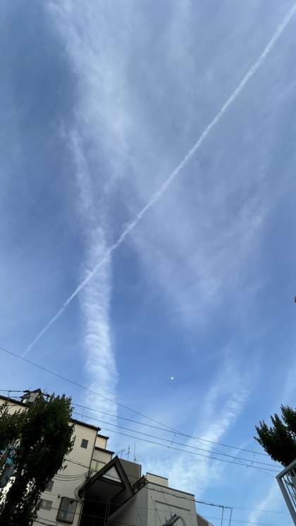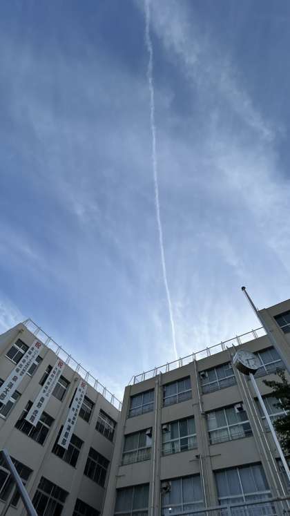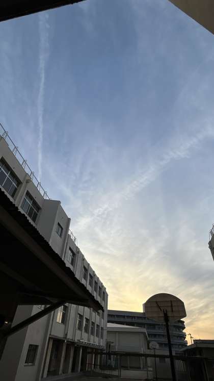 飛行機雲と煙のような薄雲です。また、夕日が建物の向こうに沈んだ後、オレンジ色に輝いていました。心が落ち着く瞬間でした。生徒の皆さんも眺めてみてはどうでしょうか?