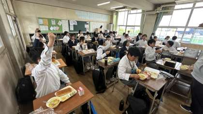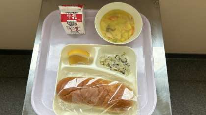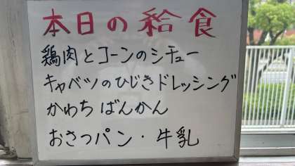 今日の給食は、鶏肉とコーンのシチュー、キャベツのひじきドレッシング、河内ばんかん。パンはおさつパンです。