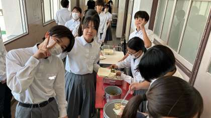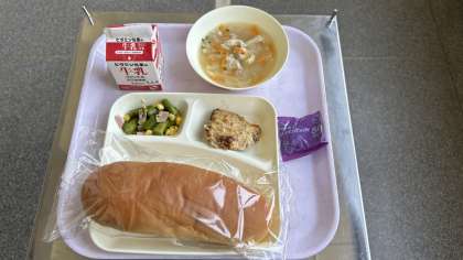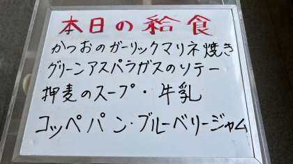 今日の給食は、鰹のガーリックマリネ焼き、押し麦のスープ、グリーンアスパラガスのソテーです。パンにはブルーベリージャムがついています。