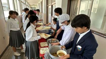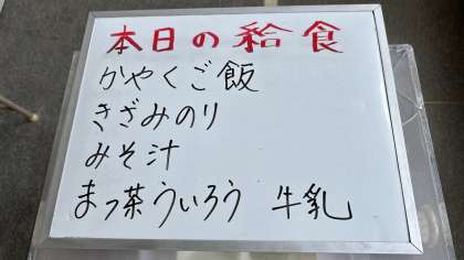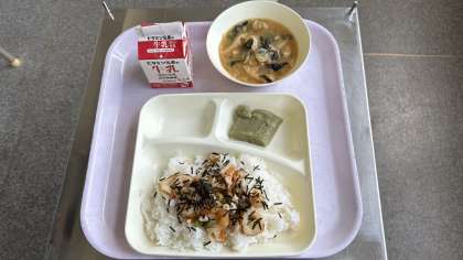 今日の給食は、かやくご飯、味噌汁、抹茶ういろうです。