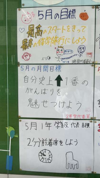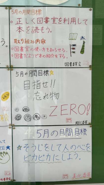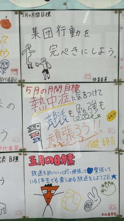 各委員会から、5月の月目標が示されています。可愛らしいイラストつきです。達成できるかな?