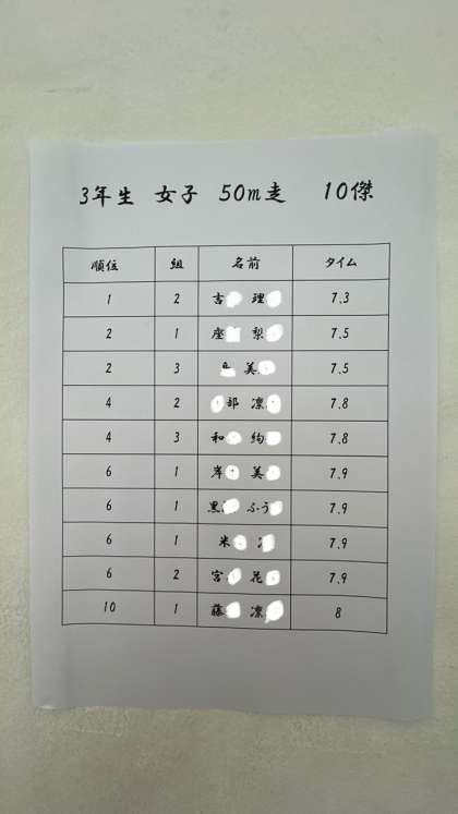 3年生の男子ハンドボール投げと女子50m走のタイムが掲示されています。