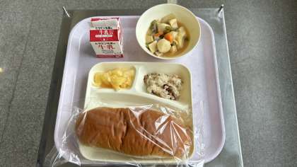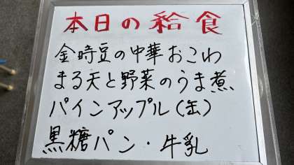 今日の給食は、金時豆の中華おこわ、まる天と野菜のうま煮、パインアップルです。パンは黒糖パンです。
