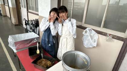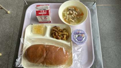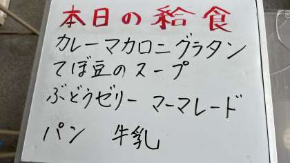 今日の給食は、カレーマカロニグラタン、てぼ豆のスープ、ぶどうゼリーです。パンにはマーマレードがついています。