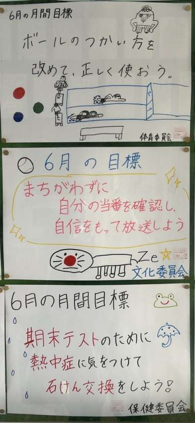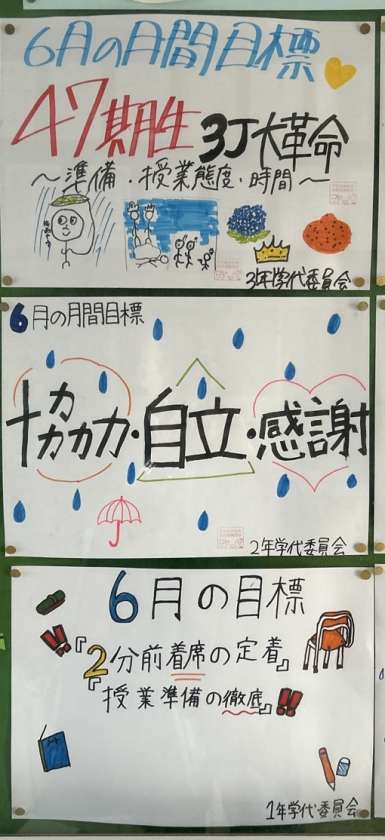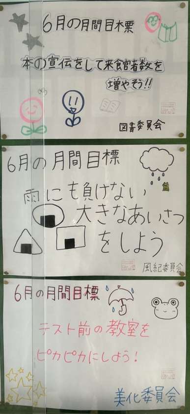 それぞれのポスターには、個性豊かなキャラクターが描かれています。梅雨時期なので、雨に関する絵が多いかな?それぞれの目標を達成できるようがんばりましょう!