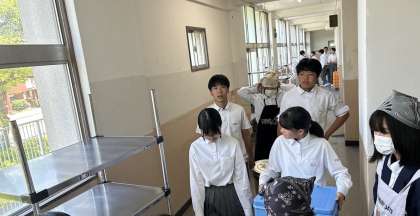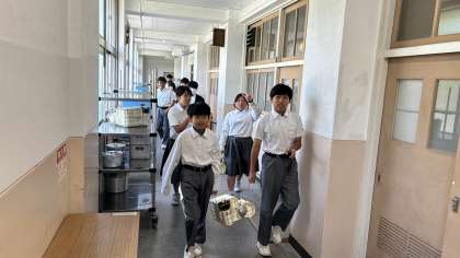 4時間目が終わり、当番の皆さんが配膳室まで給食を受け取りに来てくれています。
