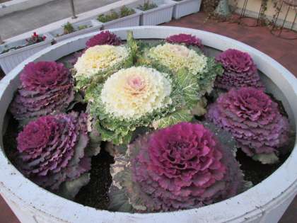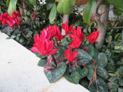 梅は2分咲き。シクラメンや葉牡丹も頑張っています。