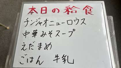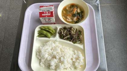 今日の給食は、チンジャオニューロウスー、中華味噌スープ、枝豆です。