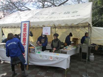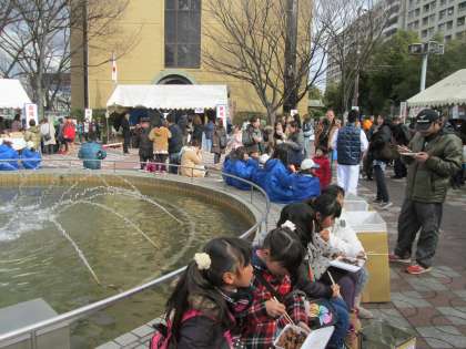 ステージに登場した子どもたちや、保護者、地域の皆さんが、噴水を囲んでお腹を満たしています。