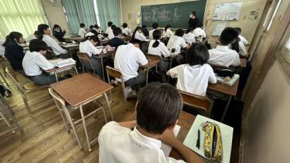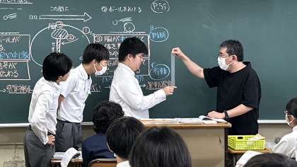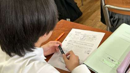 2年2組では、理科の授業です。反応の速度を測る実験をしているようです。定規が落ちるのを見てから、つかむまでの距離を測って、計算して出すようです。予測でつかんじゃダメだよ(^_-)