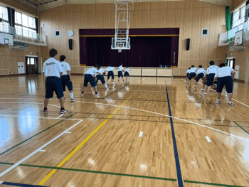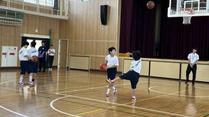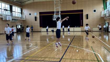 今日の体育の授業は、バスケットボールのようですね。ボールコントロールの練習をした後、シュート練習に入りました。