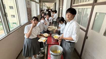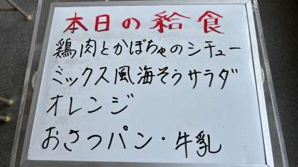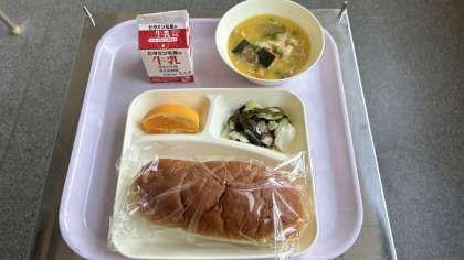 今日の給食は、鶏肉とかぼちゃのシチュー、ミックス風海藻サラダ、オレンジです。パンはおさつパンです。