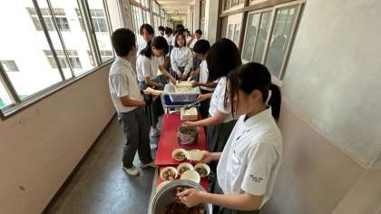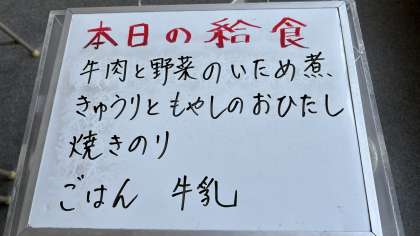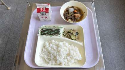 今日の給食は、牛肉と野菜の炒め煮、きゅうりともやしのおひたし、焼き海苔です。
