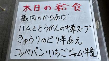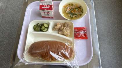 今日の給食は、鶏肉の唐揚げ、ハムと冬瓜の中華スープ、きゅうりのピリ辛和えです。コッペパンにはイチゴジャムがついています。