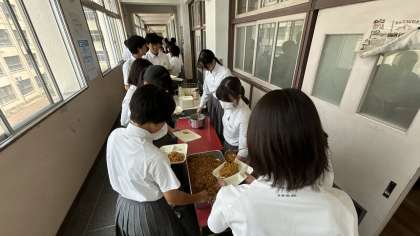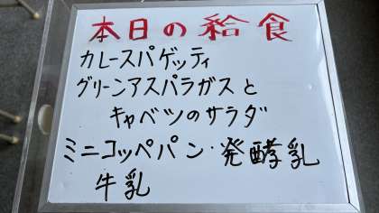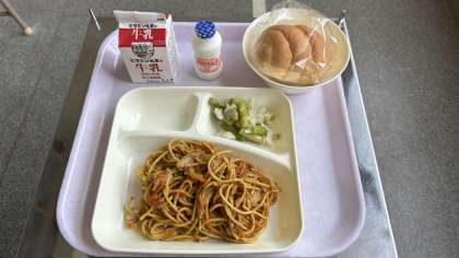 今日の給食は、カレースパゲティー、グリーンアスパラガスとキャベツのサラダ、発酵乳です。パンは2分の1の大きさのコッペパンです。